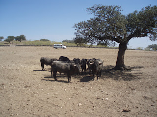 En “Los Bayones” contemplamos el apartado de dos toros en un cercado: uno para curarlo y otro para enfundarlo. Esto último me dejó mucho que desear y no me terminó de convencer, sinceramente. Para rematar, pudimos ver como el mayoral vacunaba a un toro desde lo alto de una encina aprovechando el paso del toro en cuestión bajo el árbol, cosa que ya había visto yo hacer a Fernando Cuadri en un reportaje de Toros Para Todos. Entre medias, en defensa propia nos aplicamos una paella (la primera vez en mi vida que comía paella con huevo duro) seguida de una carne, que francamente no había forma de hacerle frente tras la paella, para rematar la faena con el postre y dejar a la expedición con más ganas de echar la siesta que de tirar para “Los Bayones”. ¿A qué parezco Suárez Guanes mezclando escritos taurinos y gastronómicos.