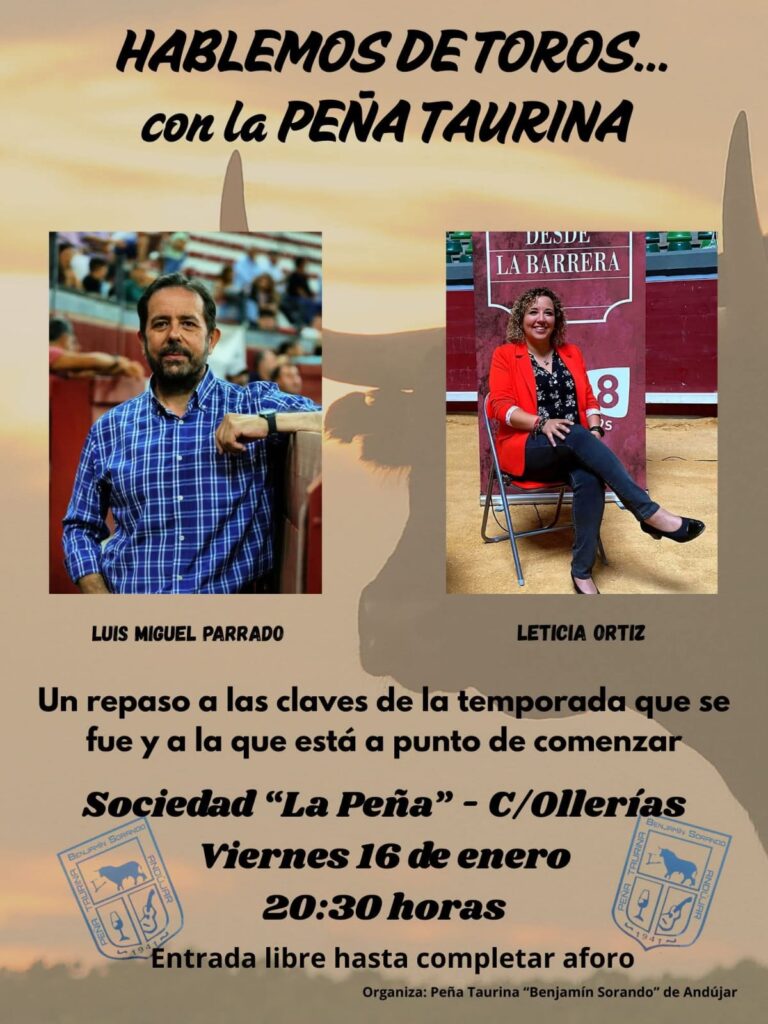 La Peña Taurina «Benjamín Sorando» de Andújar iniciará sus actividades de esta nueva temporada con la celebración de una tertulia al alimón entre los periodistas taurinos Luis Miguel Parrado y Leticia Ortiz, que harán un repaso restrospectivo a la temporada anterior y analizarán las claves de la nueva temporada taurina.